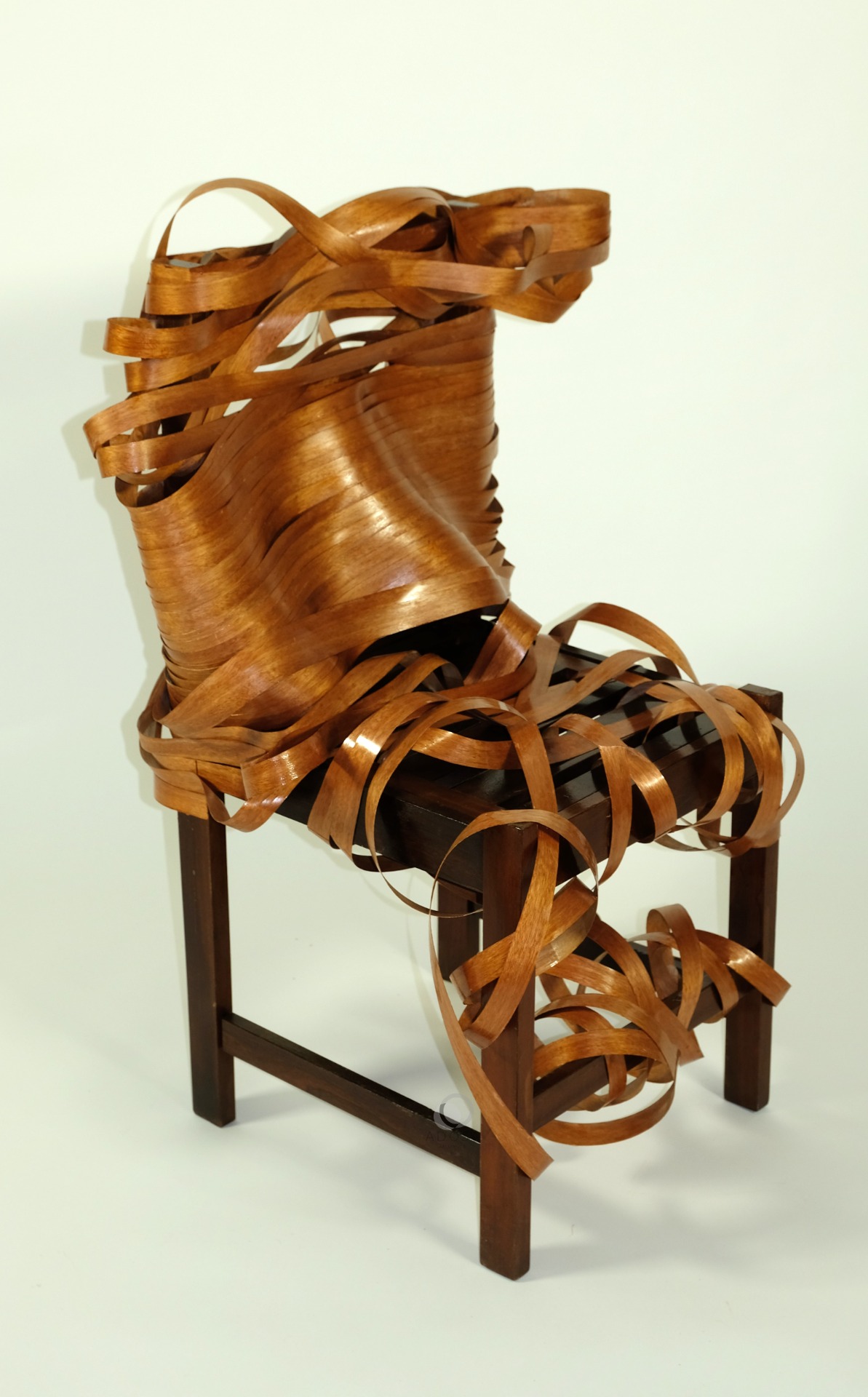 CADEIRA, 2025. Lâmina de madeira de cerejeira e cadeira de madeira recuperada, 100cm x 50cm x 50cm.