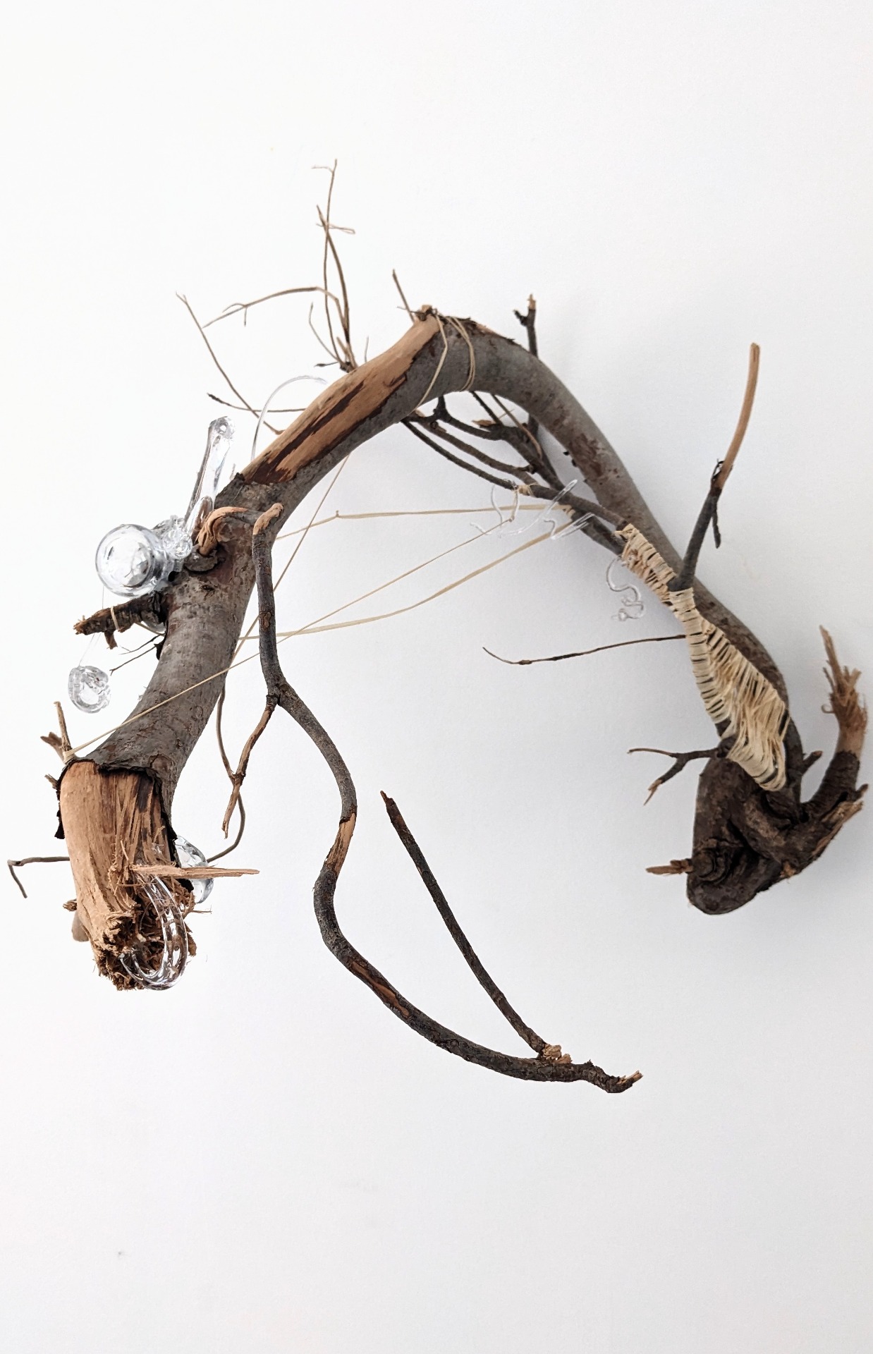 Esta escultura nasce do olhar sensível de Adosa e da sua busca contínua por revelar o diálogo íntimo entre a natureza e a matéria transformada. Madeira flutuante recolhida numa praia portuguesa, ráfia e vidro entrecruzam-se aqui num gesto poético que ultrapassa a mera combinação de materiais: tornam-se presença, respiração e memória.