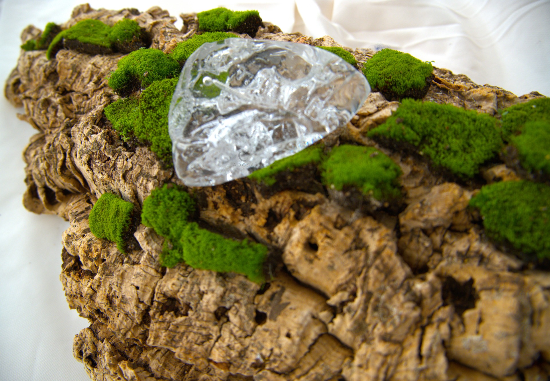 Nesta composição criada pela artista Adosa, o vidro capta a luz; a cortiça guarda a memória da terra; o musgo oferece renovação. Juntos, criam um microcosmo onde matéria e vitalidade se entrelaçam numa harmonia silenciosa.