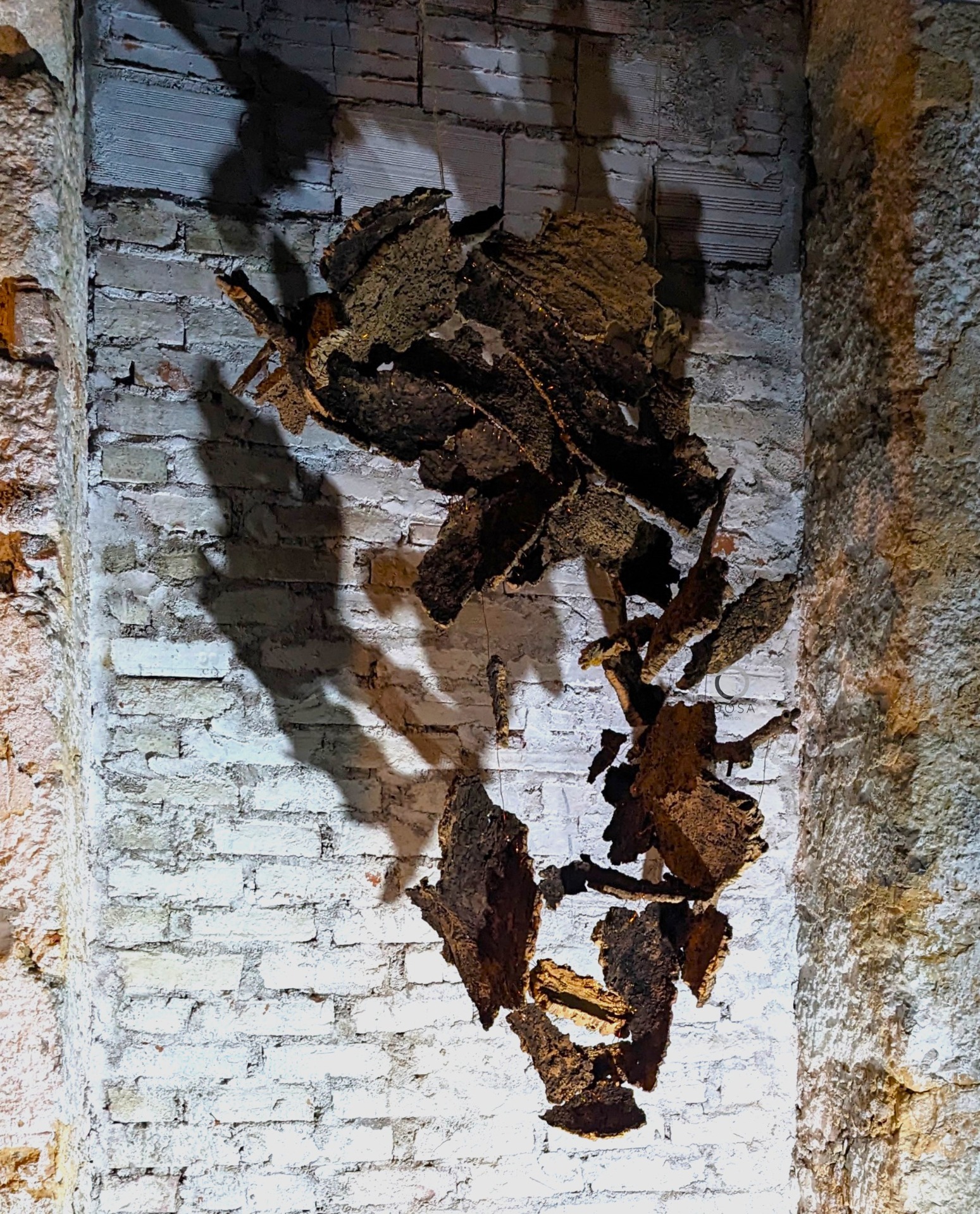 O cobre surge como presença atenta — maleável, paciente — insinuando-se na cortiça não para dominá-la, mas para revelar a possibilidade de reconciliação. O encontro entre estes materiais cria uma estrutura que é, ao mesmo tempo, frágil e resistente: uma cicatriz afirmada, visível, que não procura esconder o dano, mas transformá-lo em gesto de reparação.